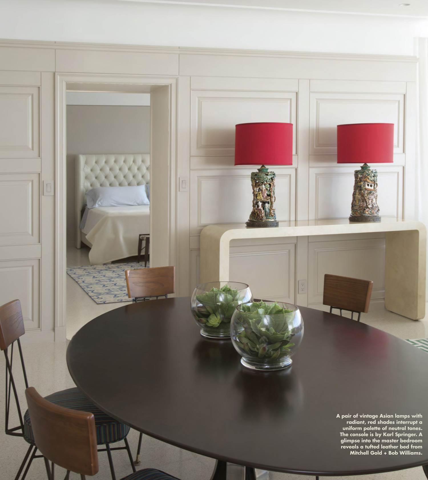 An ocean-front apartment in a mid-century modern building on Miami Beach had its interior fully removed and rebuilt in a gracious new layout, with two bedrooms, 2-1/2 baths, and an open kitchen. Painted raised wood paneling, curved plaster cornices, and materials such as terrazzo floors reflect the cosmopolitan beach style from the building’s era.